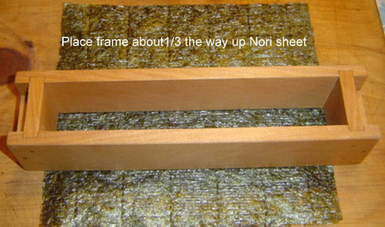Place the Sushi King frame on a Seaweed (Nori) sheet about a third the way up