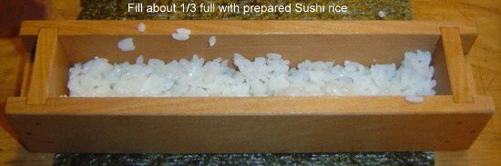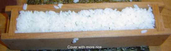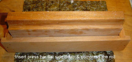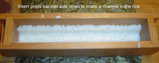 Fill the frame about 1/3 full with your prepared rice & insert the press bar in the frame to create the channel in the rice. Then put a layer of rice on top.