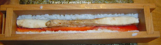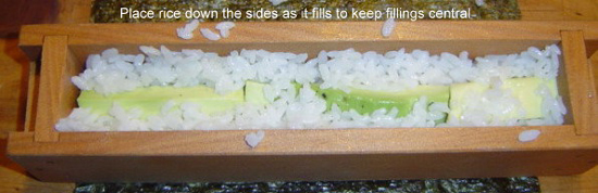 Fill the channel with your selected fillings, as the frame fills put a bit of rice down the sides to keep the fillings central. Then put a layer of rice on top.