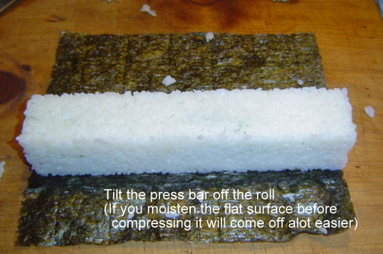 Before using, run the Sushi King frame & press bar under water to moisten them to stop rice sticking. Dry the outside of the frame, do not put wet frame on Seaweed (Nori) sheet -you may need to do this every couple of rolls.