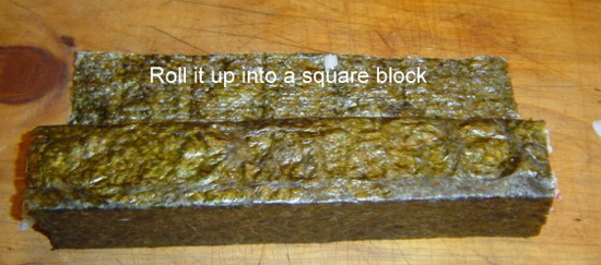 Fold Nori sheet up around the rice & roll it up. If you place a few grains of rice along the last edge it will help stick it down.