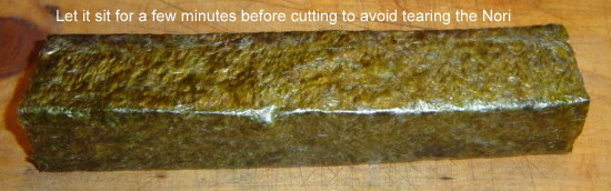 Leave for about 5 minutes before cutting to allow the rice to moisten the Nori sheet. This will avoid tearing.